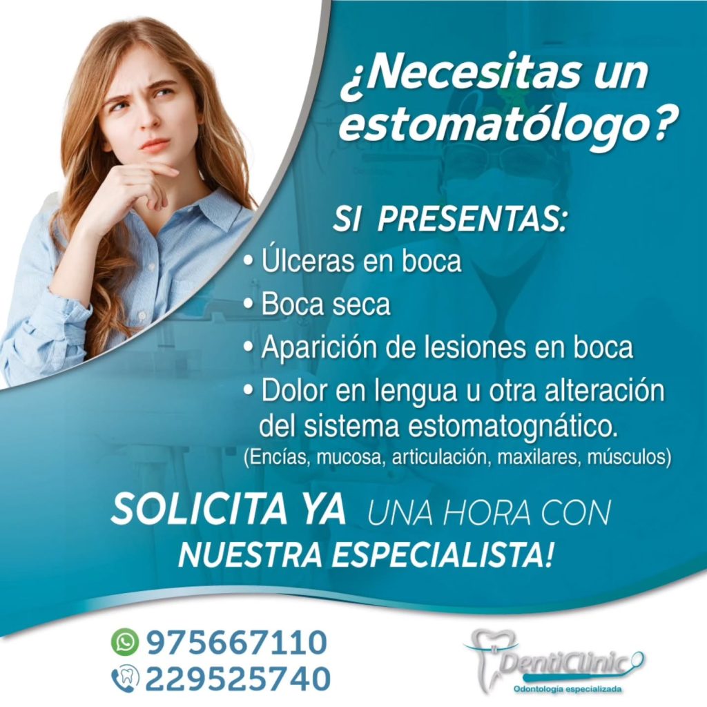 Es la rama de la medicina que se encarga de Diagnóstico, prevención, y tratamiento de las enfermedades de la boca, recuerda en boca hay mas estructuras no sólo dientes y encias , en algunos casos se pueden presentar manifestaciones de enfermedades originadas otro lugar del cuerpo y que tienen sus manifestaciones orales. Solicita tu evaluacion con nuestra especialista en estomatologia y oncologia oral si presentas alteraciones en tu cavidad oral, y aun no tienes un diagnóstico.